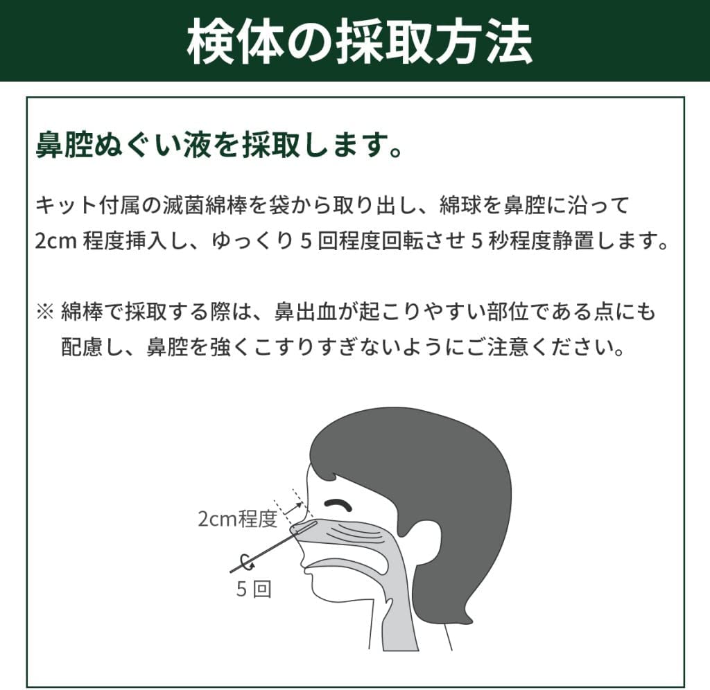| 使用方法 | ●鼻腔ぬぐい液を採取します。 キット付属の滅菌綿棒を袋から取り出し、綿球を鼻腔に沿って2cm程度挿入し、ゆっくり5回程度回転させて5秒程静置します。 ●検体を採取した綿棒を速やかに検体希釈液入りチューブに入れます。綿球をチューブの内側に約10秒間、回転させながら押し付けてください。 ●キャップをチューブに押し込んで閉めてください。次にチューブを振って検体と希釈液を混合させます。 ●テストプレートのSの印字があるくぼみ2か所に、それぞれ3滴の抽出液を滴下し静置します。テストプレートを8分静置した後、結果を読みます。 ●判定結果 |
